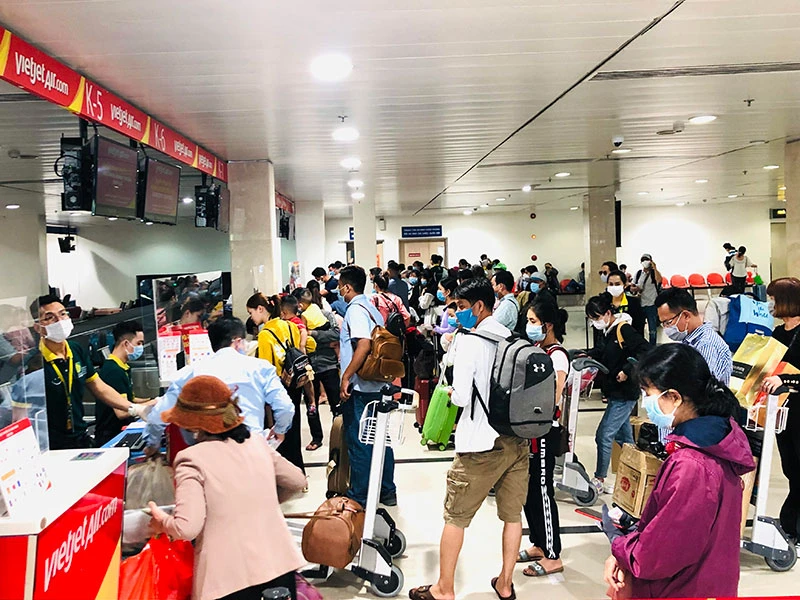 Dịch bệnh được kiểm soát tốt, khách từ sân bay Tân Sơn Nhất đảo chiều đông đúc những ngày cận tết. Ảnh: PHONG ĐIỀN