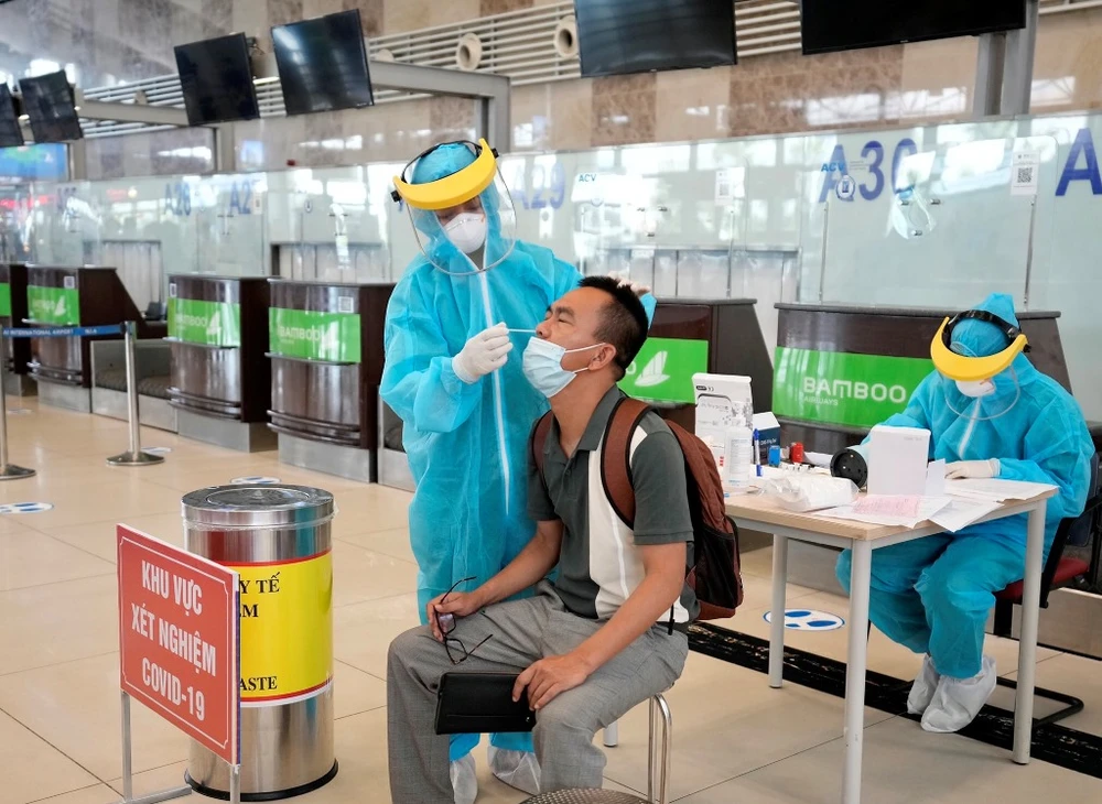 Nhân viên y tế tiến hành lấy mẫu test nhanh COVID-19 cho một hành khách.