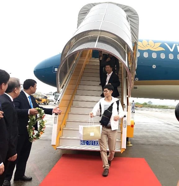 Vị khách thứ 115 triệu trong năm 2019 đến sân bay Phú Bài (Huế) sáng 29-12. Ảnh: P.ĐIỀN