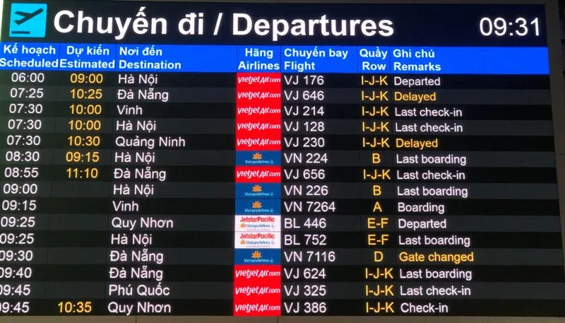 Tại ga quốc nội, lịch bay các hãng hàng không Việt Nam xếp kín mít từ sáng sớm đến khuya. Tình trạng các chuyến bay delay vẫn còn diễn trên một số chặng bay TP.HCM đi Hà Nội, Đà Nẵng, Vinh, Hải Phòng, Quảng Ninh ra từ 1-3 tiếng, trong đó hãng Vietjet có tỉ lệ chuyến bay bị delay nhiều nhất.