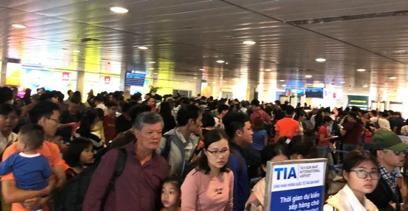 Biển người xếp hàng trước khu vực làm thủ tục kiểm tra an ninh sân bay Tân Sơn Nhất, sáng 18-1. Ảnh: P.ĐIỀN