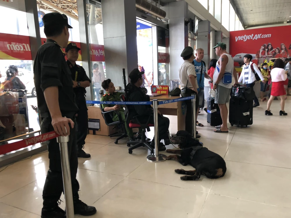 Ngoài lực lượng an ninh hàng không được huy động 100% quân số, các đơn vị phối hợp và chó nghiệp vụ cũng huy động túc trực tại ga quốc nội dịp cao điểm Tết. Ảnh: P.ĐIỀN