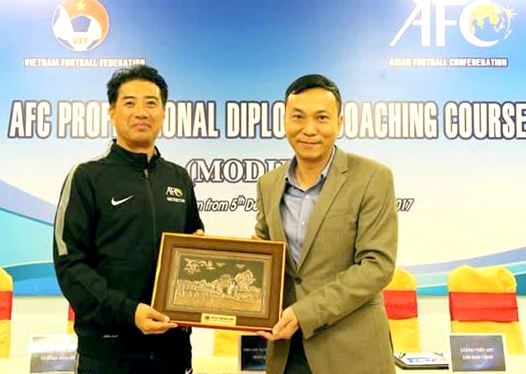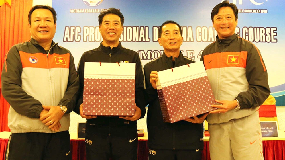 Ông Yusuke (thứ hai từ trái) tại buổi bế giảng khóa đào tạo, cấp bằng cho các HLV Việt Nam. ẢNH: VFF