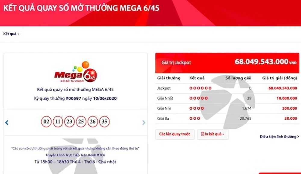 Hôm nay, 12-6, Mega 6/45 sẽ mở thưởng kỳ quay #00598. Nhìn vào mức tăng trong các kỳ quay đã qua, có thể dự đoán gần như chắc chắn Jackpot của kỳ quay này sẽ vượt xa 70 tỉ đồng.