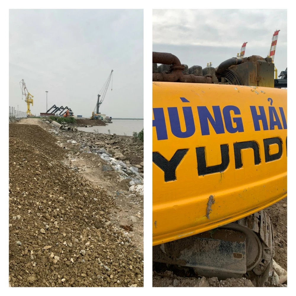 Tiếp đó, họ huy động xe tải chở đổ đất, cát san lấp dải đất bãi triều kẹp giữa ranh giới bến phà Đình Vũ và Công ty cổ phần hóa dầu quân đội.