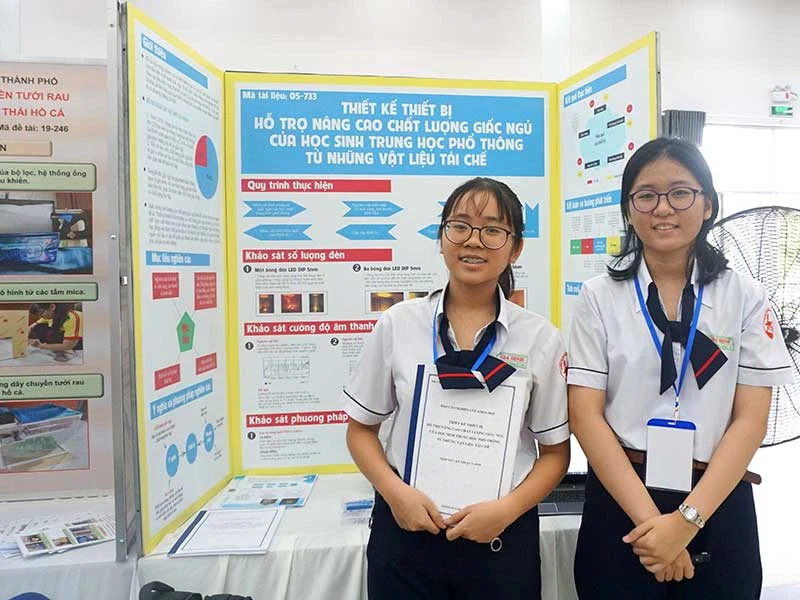 Xuất phát từ thực tế, học sinh Trường THPT Gia Định đã thực hiện đề tài “Thiết kế thiết bị hỗ trợ nâng cao chất lượng giấc ngủ của học sinh THPT từ những vật tái chế”. Ảnh: NGUYỄN QUYÊN