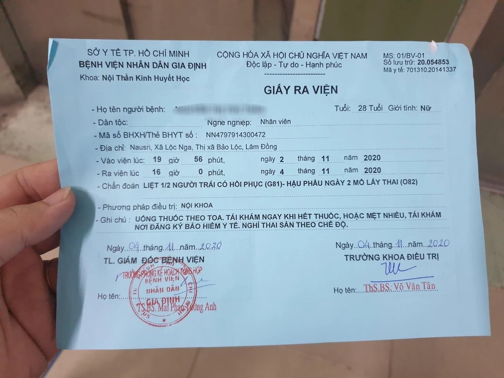 Sau khi bị liệt, chị được đưa qua BV Nhân dân Gia Định 2 ngày và đưa về lại BV Phụ sản Mê Kông để chăm sóc hậu phẫu.