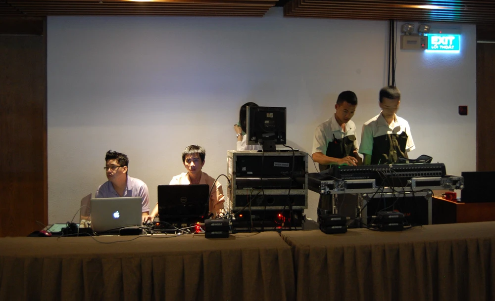 Đội ngũ kỹ thuật chuẩn bị cho đêm trao giảiFair Play 2014.Ảnh: HUYỀN VI