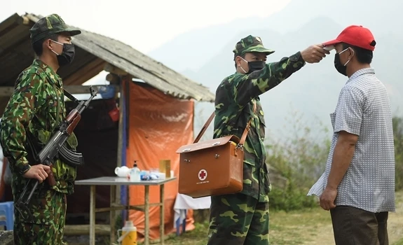 Tổ công tác biên phòng Đồn Tả Gia Khâu, Bộ đội Biên phòng tỉnh Lào Cai đo thân nhiệt người dân qua chốt kiểm soát. Ảnh: QĐND