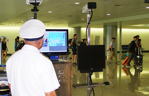 Nhân viên Trạm kiểm dịch y tế quốc tế TP.HCM đang theo dõi thân nhiệt của du khách qua cửa khẩu Tân Sơn Nhất. Ảnh: TRẦN NGỌC