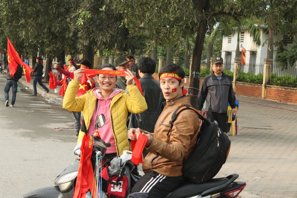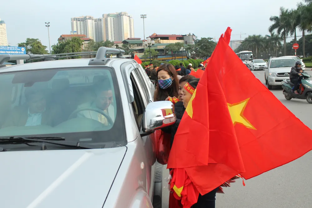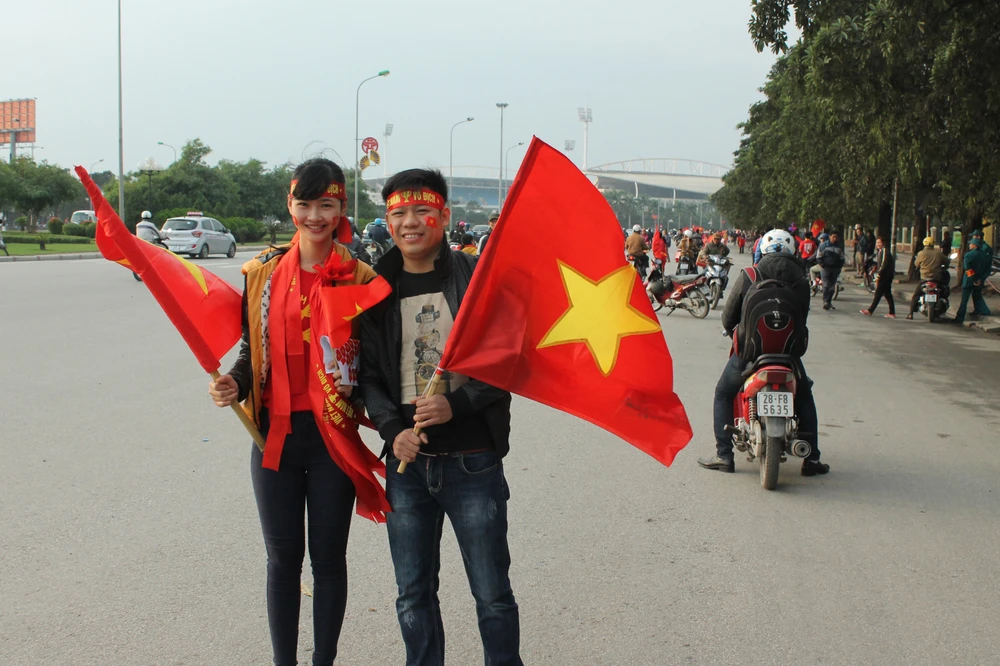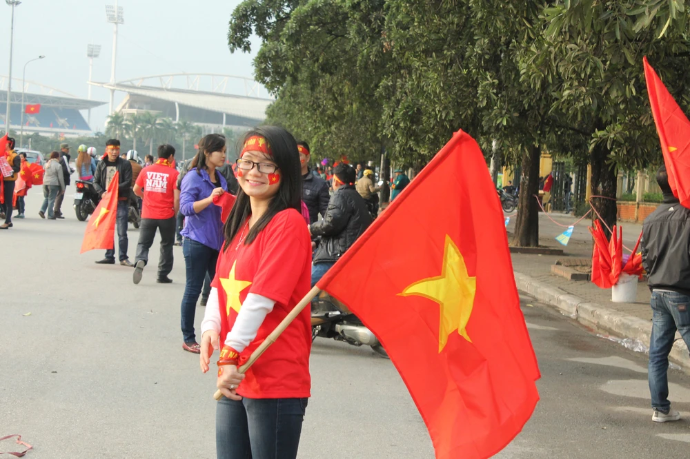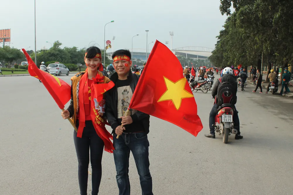 Người hâm mộ Việt Nam khoác lên mình áo đỏ, “trang điểm” thêm tấm băng rôn trên đầu với dòng chữ “Việt Nam chiến thắng” và một lá cờ xinh xắn bên má, miệng khản đặc tiếng hô: “Việt Nam vô địch! Việt Nam vô địch!”.