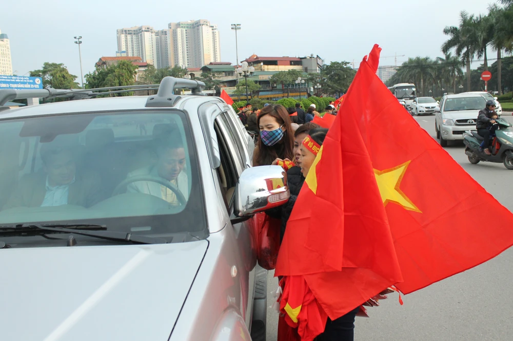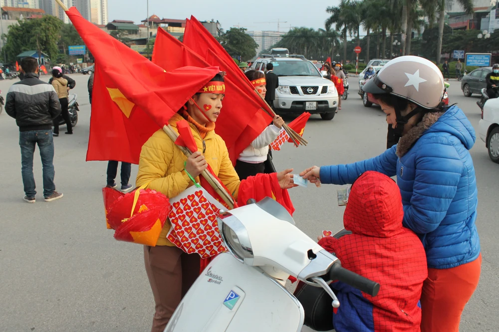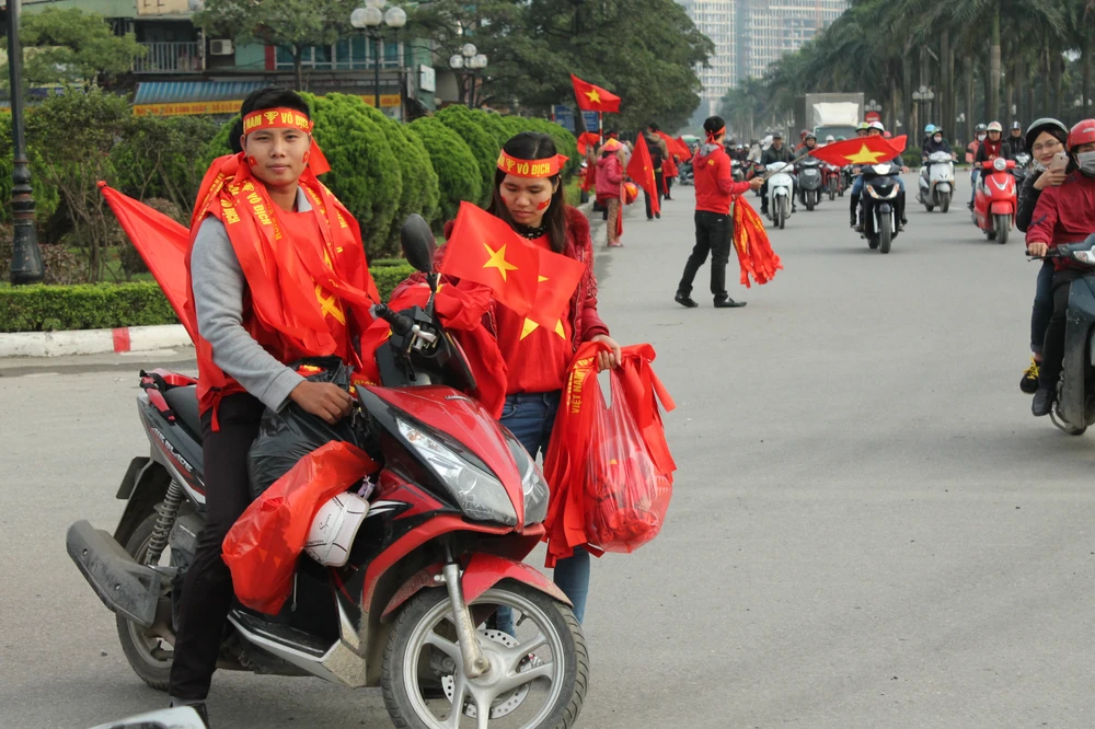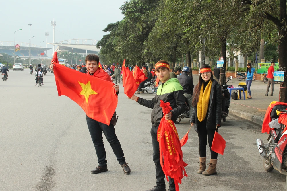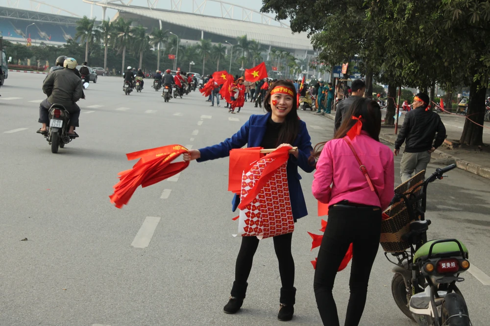 Người hâm mộ Việt Nam khoác lên mình áo đỏ, “trang điểm” thêm tấm băng rôn trên đầu với dòng chữ “Việt Nam chiến thắng” và một lá cờ xinh xắn bên má, miệng khản đặc tiếng hô: “Việt Nam vô địch! Việt Nam vô địch!”.