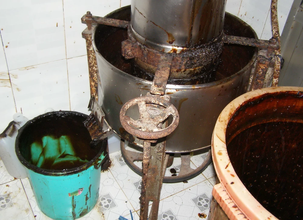 Máy chiết tương đen cũ kỹ, rỉ sét. Ảnh: TRẦN NGỌC