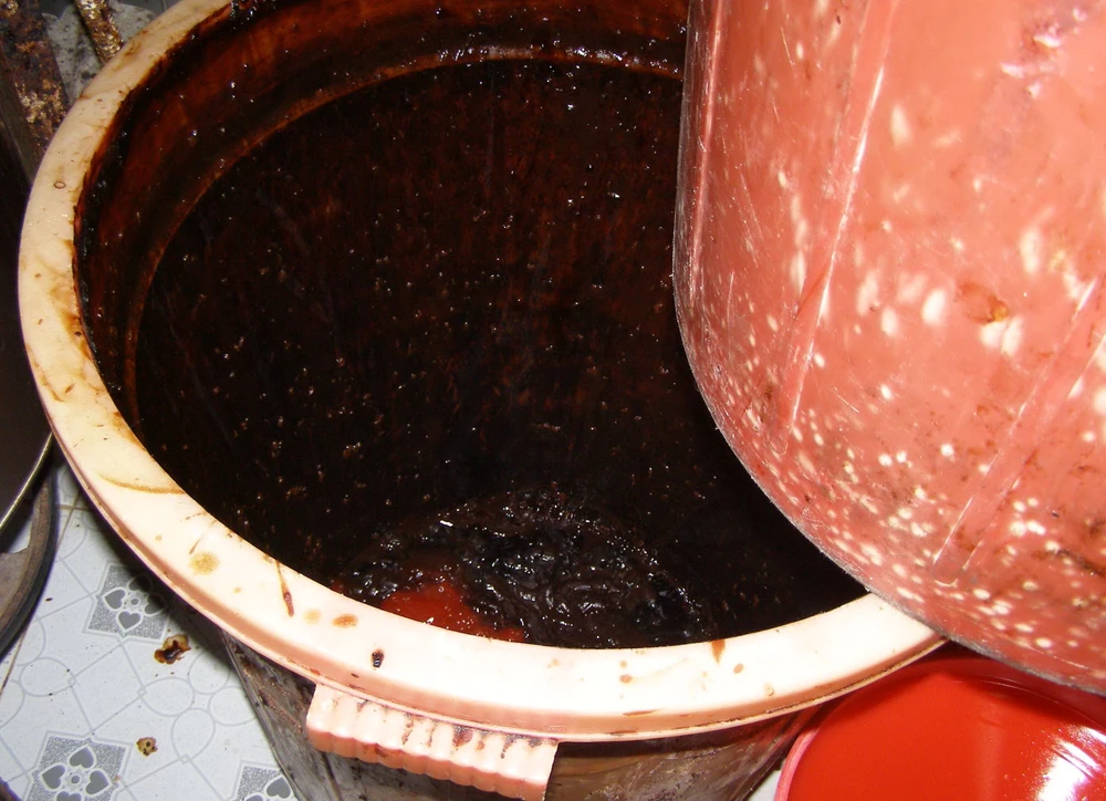 Tương đen đựng trong thùng nhựa dơ bẩn, không che đậy nên dễ bám bụi. Ảnh: TRẦN NGỌC