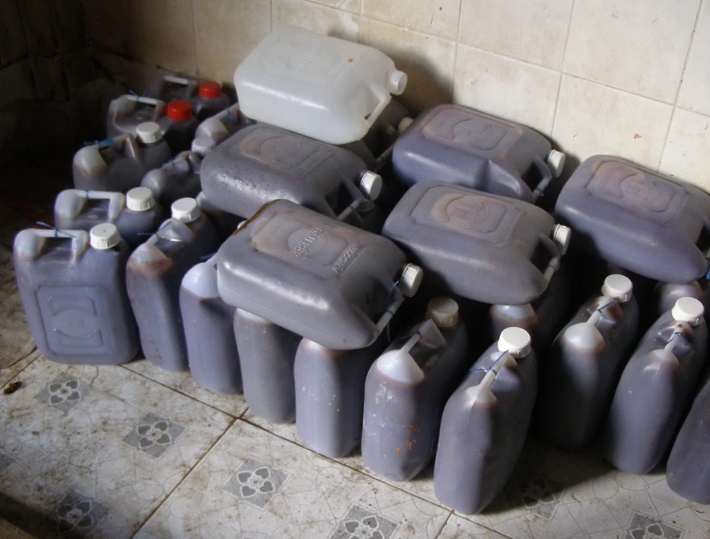 “Công nghệ” chiết tương vô bình nhựa được thực hiện trên nền đất. Máy chiết tương cũ kỹ, rỉ sét, không đảm bảo vệ sinh. Bình nhựa rỗng để tràn dưới đất, nắp đậy đóng đầy bụi. Một con chó thản nhiên qua lại khu vực chiết và đóng bình tương, thỉnh thoảng đưa lưỡi liếm miệng bình.