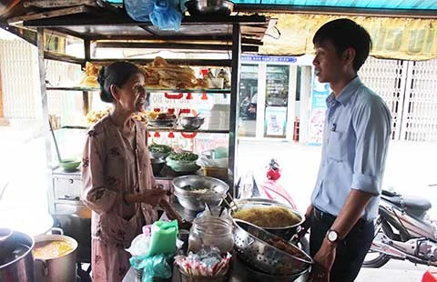 Anh Nguyễn Trần Vũ Phương hỏi thăm công việc buôn bán của hộ bà Phan Thị Yến. Ảnh: H.LAN