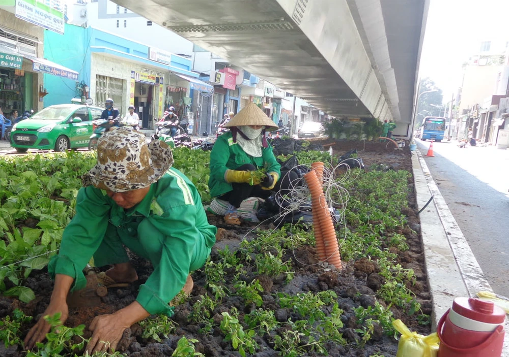 Dải phân cách, bồn hoa, cây cảnh bên dưới dạ nhánh cầu vượt được trồng tạo môi trường xanh cho khu vực.