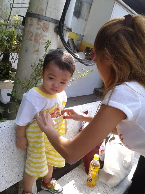 Mẹ bé Bo chỉnh lại quần áo cho con . Ảnh: H.Lan