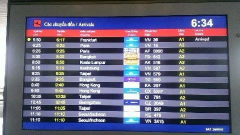 Bảng điện tử tại sân bay Nội Bài thông báo chuyến bay của Bộ trưởng Phùng Quang Thanh đã hạ cánh. Ảnh: Đặng Trung-Tuyến Phan.