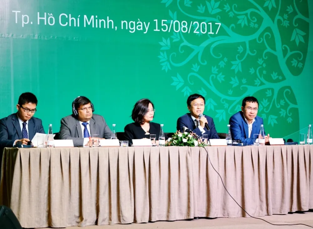 Hình 1: Ông Nguyễn Đức Vinh và ban lãnh đạo VPBank đang trả lời các thắc mắc của cổ đông, đối tác, nhà đầu tư tại hội thảo diễn ra chiều 15-8