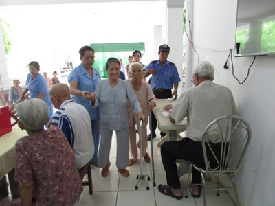 Phường An Thới tổ chức thùng phiếu phụ dành cho những người già tại Trung tâm Nuôi dưỡng người già và trẻ em không nơi nương tựa TP Cần Thơ. Trong ảnh là nhân viên trung tâm dìu các cụ còn đi lại được đến khu vực bỏ phiếu. Ảnh: N.NAM