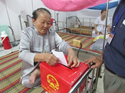 Những cụ không đi lại được nhưng tinh thần còn minh mẫn như cụ Võ Thị Tư (83 tuổi) trong ảnh thì tổ bầu cử mang thùng phiếu đến tận giường để cụ bỏ phiếu. Ảnh: N.NAM