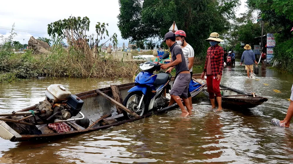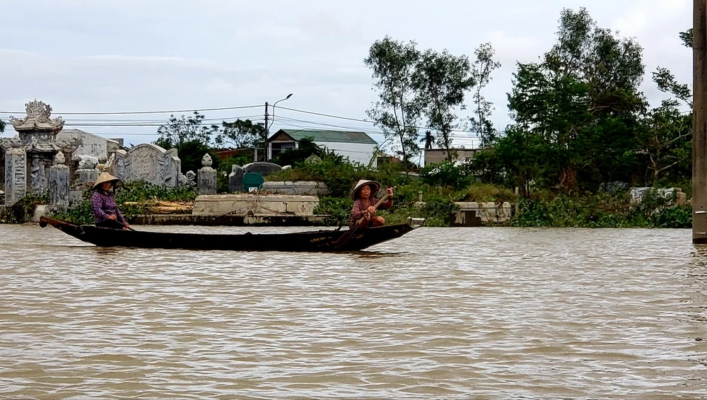 Tại những khu vực ngập sâu, người dân phải dùng thuyền để di chuyển. Ảnh: T.AN