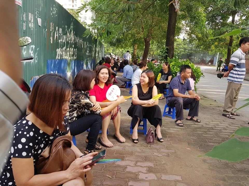 Thời tiết tại Hà Nội sáng nay khá oi bức, các bậc phụ huynh đợi con mình ngoài cổng điểm thi trò chuyện về quá trình thi của con em mình.