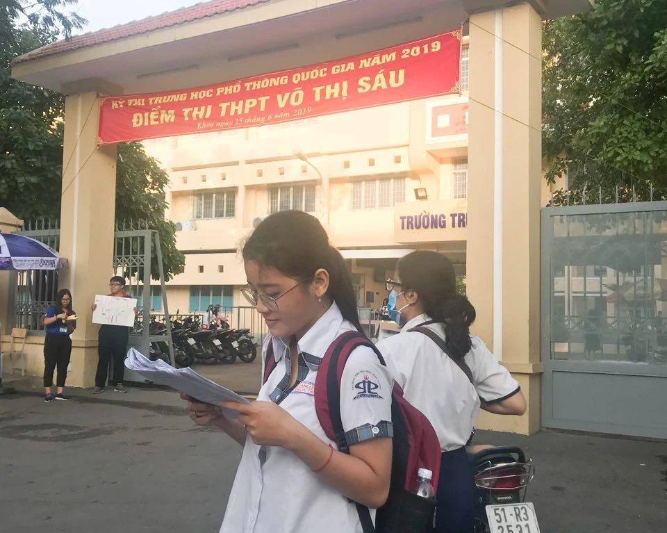 Điểm thi THPT Võ Thị Sáu (Bình Thạnh) Từ lúc 6h, nhiều thí sinh đã có mặt. Các em đang tranh thủ xem lại phòng thi, và kiểm tra các dụng cụ như máy tính, đồng hồ, thước kẻ... trước khi bước vào phòng thi.