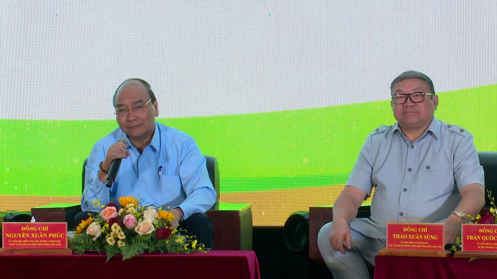 Thủ tướng Chính phủ Nguyễn Xuân Phúc cùng các đại biểu đang đối thoại với nông dân.
