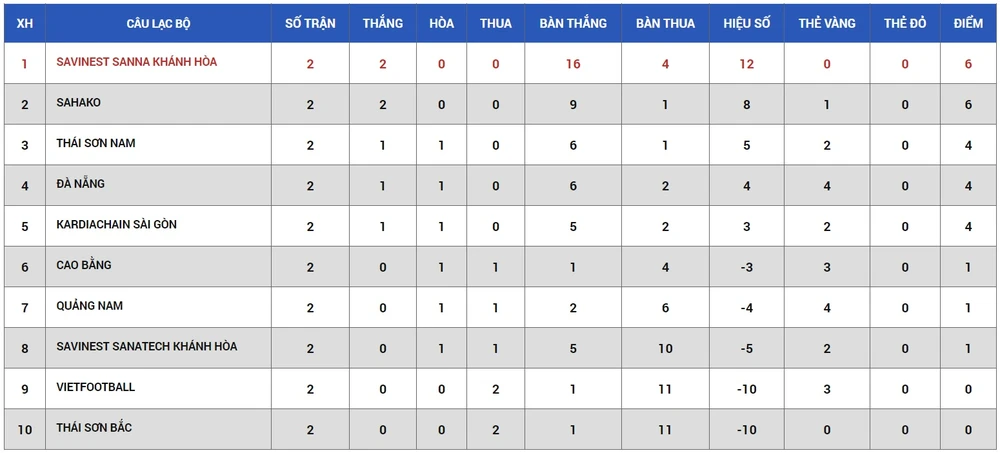 Thứ hạng các đội sau hai lượt trận.