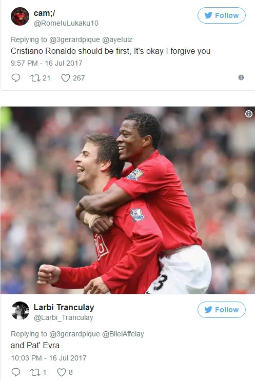 Theo ý kiến của người hâm mộ thì Ronaldo phải là số một. Có fan còn troll Pique khi nói "còn Patrick Evra", cựu đồng đội của Pique tại Manchester United.