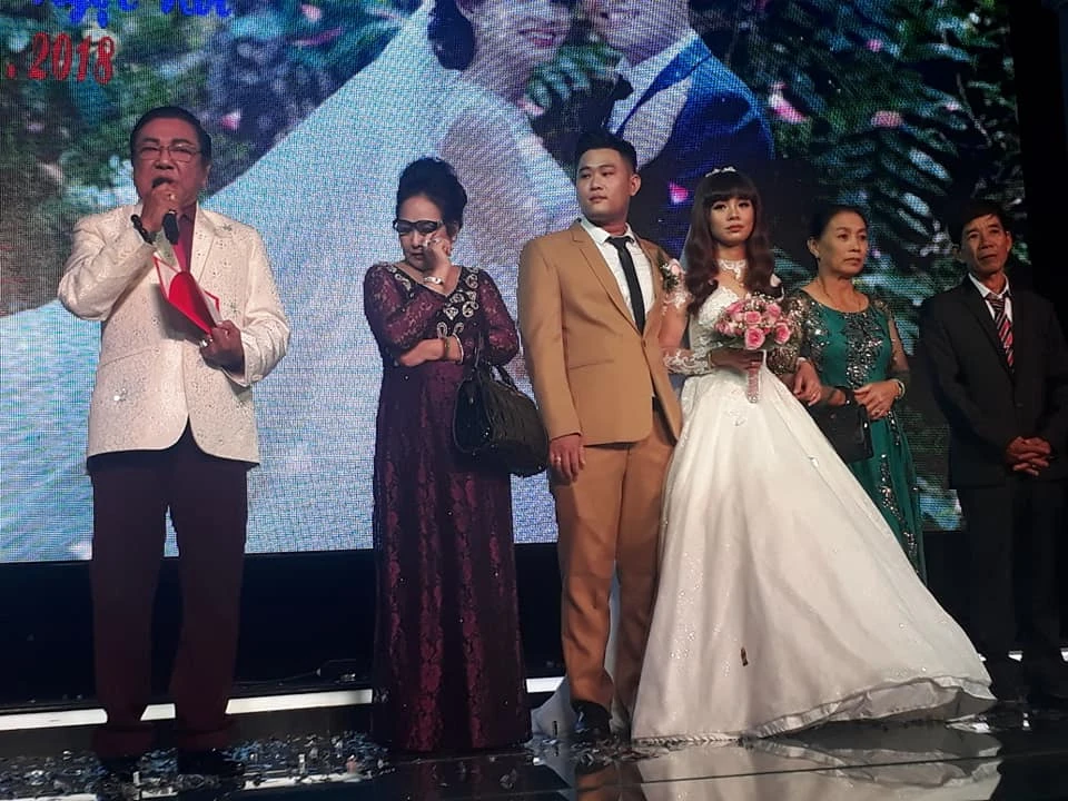 Nghệ sĩ Phú Quý, vợ nghệ sĩ Thanh Sang, xúc động trên sân khấu khi nghe nhắc đến chồng, cô dâu, chú rể và cha mẹ cô dâu.
