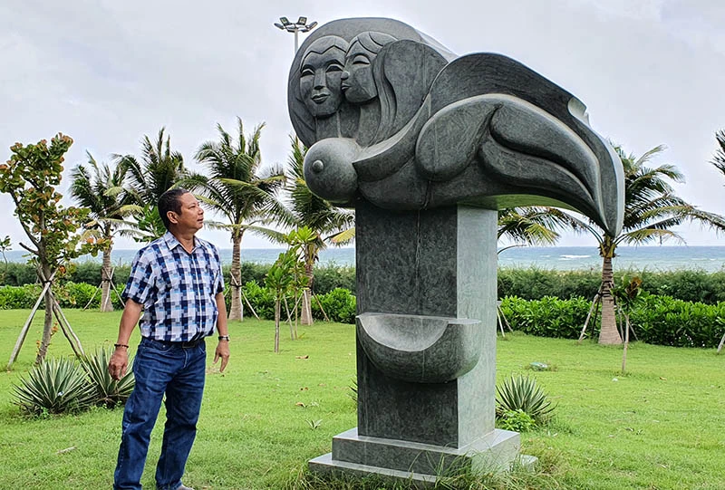 Ông Nguyễn Thành Vinh và tác phẩm "Tình biển" bị sao chép, đặt tại công viên ven biển TP Tuy Hòa. Ảnh: TRỌNG KHÔI