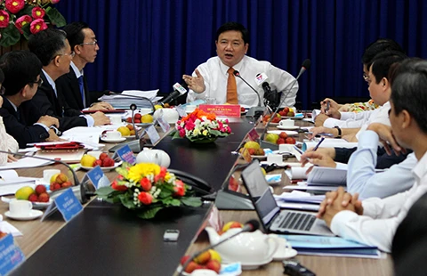 Bí thư Thành ủy TP.HCM Đinh La Thăng làm việc với Học viện Cán bộ TP.HCM sáng 4-3. Ảnh: HOÀNG GIANG