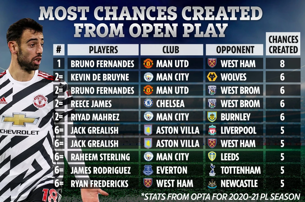 Tờ The Sun (Anh) vừa đưa ra thống kê cầu thủ tạo nhiều cơ hội nhất cho đồng đội lập công trong 1 trận đấu cụ thể ở Premier League 2020-2021. Theo đó, Bruno Fernandes của Manchester United đứng đầu danh sách với 8 lần mở ra cơ hội cho đồng đội ghi bàn vào lưới West Ham.