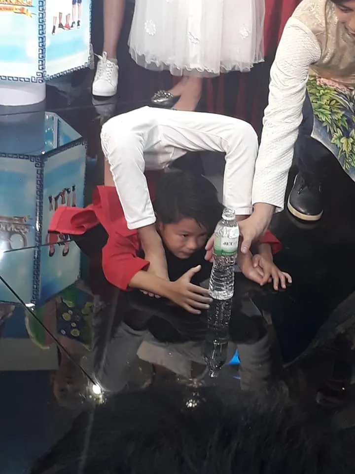 Cậu bé Minh Nhật biểu diễn xiếc tại chỗ.
