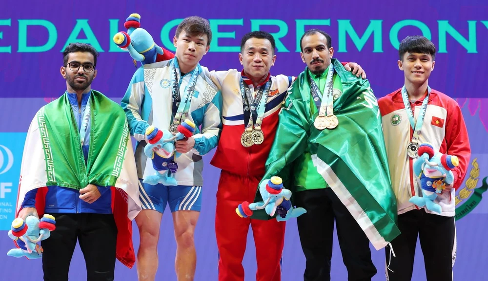 Nguyễn Trần Tuấn Anh (phải) giành HCB nội dung cử giật hạng 55 kg nam. ẢNH: IWF
