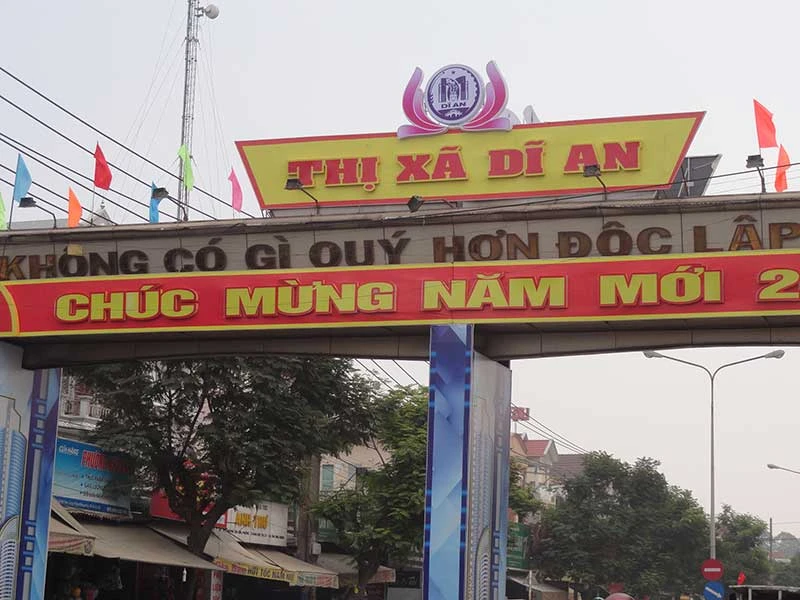 Thế nhưng ngay ngã tư 550, khu phố Tân Long, phường Tân Đông Hiệp, thị xã Dĩ An (Bình Dương) vẫn tồn tại bảng ghi địa phận huyện Dĩ An (ảnh 1). Cách bảng này khoảng 100 m là cổng chào thị xã Dĩ An (ảnh 2).