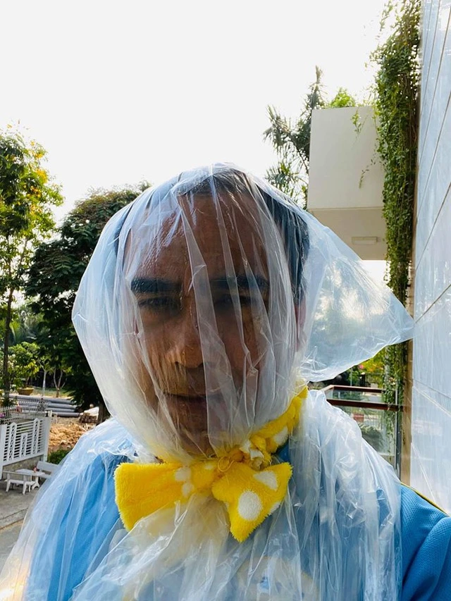 Diễn viên Quyền Linh với khẩu trang bịch nylon hài hước. Anh viết: “Dậy đi tập thể dục tiêu diệt Covy bà con ơi”.