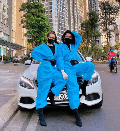 Nhã Phương và Thúy Ngân rủ nhau chống dịch với kính bảo hộ, khẩu trang, áo mưa