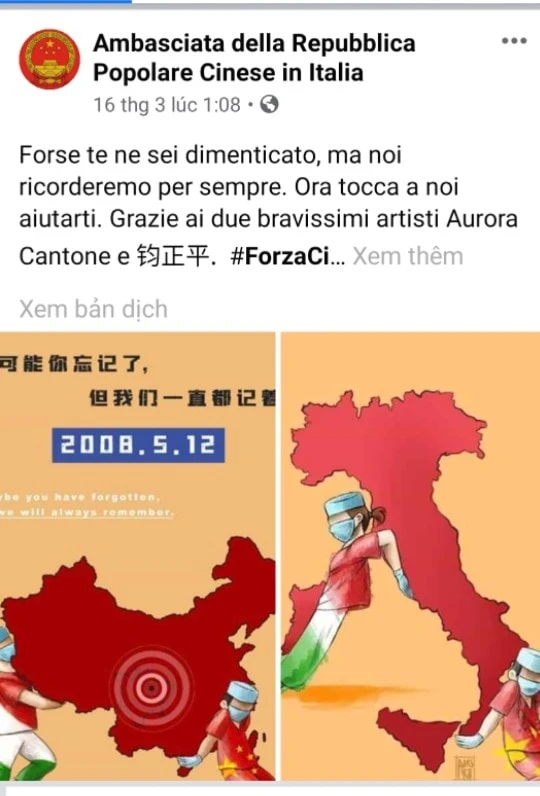 Ngày 16-3, trang Facebook chính thức của Đại sứ quán Trung Quốc tại Ý đã đăng một bài viết có hình vẽ hai nhân viên y tế mặc trang phục in cờ Ý và cờ Trung Quốc đang cùng nâng đỡ bản đồ của hai nước. Bức ảnh ghi chú: “Forse te ne sei dimenticato, ma noi ricorderemo per sempre. Ora tocca a noi aiutarti…” (tạm dịch: Bạn có thể đã quên nhưng chúng tôi sẽ luôn nhớ. Bây giờ chúng tôi sẽ giúp bạn).