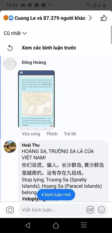 Ca sĩ mạng Châu Khải Phong bình luận bằng tiếng Anh và tiếng Việt: “Hỡi tất cả anh em, tất cả FC của Châu Khải Phong, chúng tôi xin khẳng định một lần nữa, Hoàng Sa, Trường Sa là của Việt Nam nha mấy bạn”.