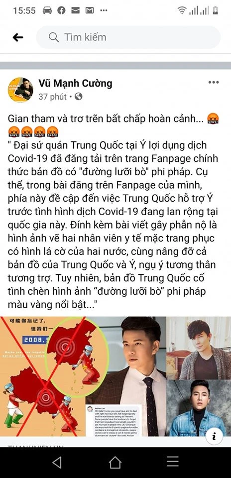 MC Vũ Mạnh Cường viết: “Hôm trước một đài truyền hình Mỹ khi đưa hình ảnh Việt Nam để nói về bài Ghen Covy cũng không để hình ảnh hai quần đảo Hoàng Sa và Trường Sa, làm niềm vui chẳng trọn vẹn. Hôm nay đến việc này. Quá bức xúc. Hoàng Sa và Trường Sa là của Việt Nam. Nên không thể lập lờ được chuyện này...”.