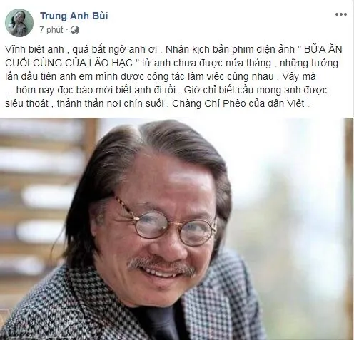 Nghệ sĩ Trung Anh bất ngờ khi người anh qua đời: "Vĩnh biệt anh, quá bất ngờ anh ơi. Nhận kịch bản phim điện ảnh "Bữa ăn cuối cùng của Lão Hạc" từ anh chưa được nửa tháng, những tưởng lần đầu tiên anh em mình được cộng tác làm việc cùng nhau. Vậy mà....hôm nay đọc báo mới biết anh đi rồi. Giờ chỉ biết cầu mong anh được siêu thoát, thảnh thản nơi chín suối. Chàng Chí Phèo của dân Việt".
