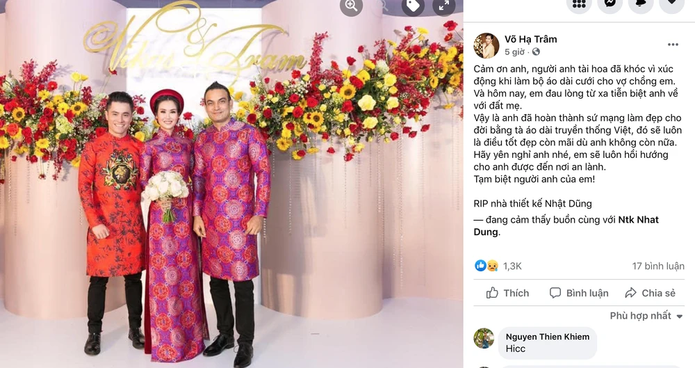 Vậy là anh đã hoàn thành sứ mạng làm đẹp cho đời bằng tà áo dài truyền thống Việt, đó sẽ luôn là điều tốt đẹp còn mãi dù anh không còn nữa. Hãy yên nghỉ anh nhé, em sẽ luôn hồi hướng cho anh được đến nơi an lành. Tạm biệt người anh của em”- Võ Hạ Trâm chia sẻ.