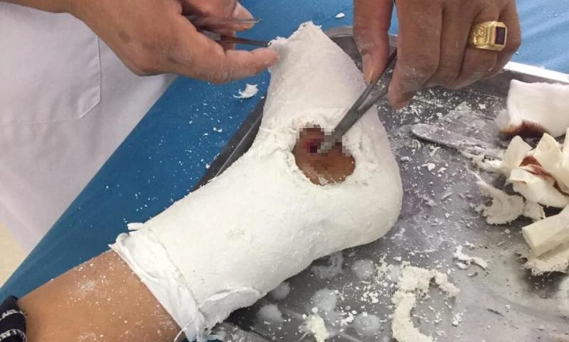 Em Lê được đưa đến bệnh viện cấp cứu trong tình trạng bị sắt đâm rách thịt lộ xương chân. Qua chụp phim cho thấy em Lê bị mẻ, rạn xương chân. Các y, BS đã khâu vết thương và bó bột bàn chân cho em Lê.