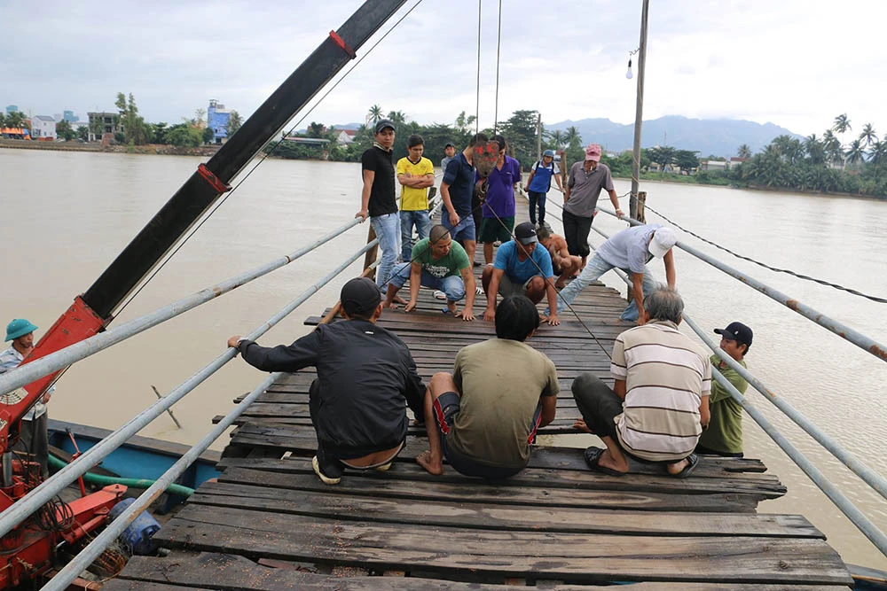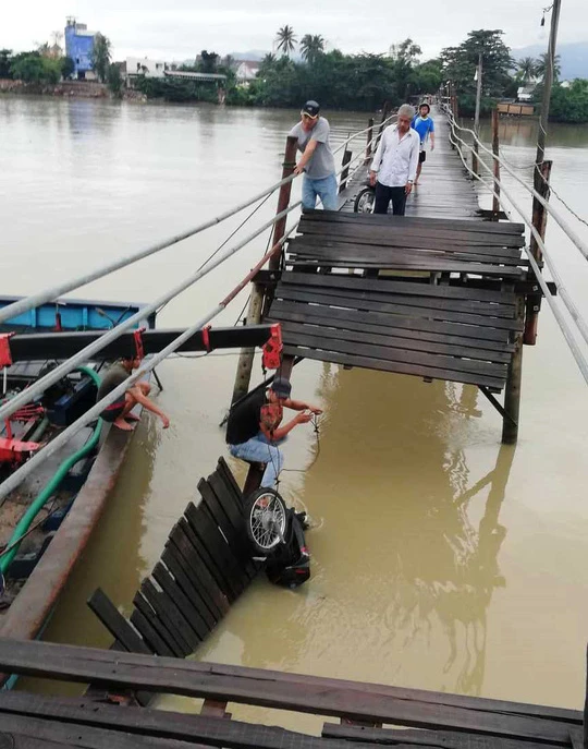 Một đoạn hơn 10 m cầu gỗ Phú Kiểng bắc qua sông Cái ở Nha Trang bị sập.