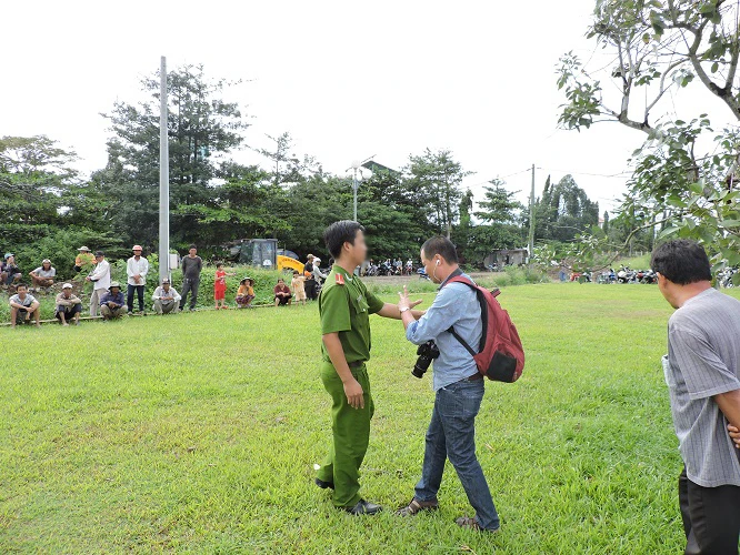 Tai hiện trường, rất đông PV báo đài bị ngăn cản tác nghiệp, dù đứng bên ngoài cách hiện trường khoảng 50m để chụp ảnh cũng bị túm áo, xô đẩy dù không có vòng dây xác lập rào cấm.