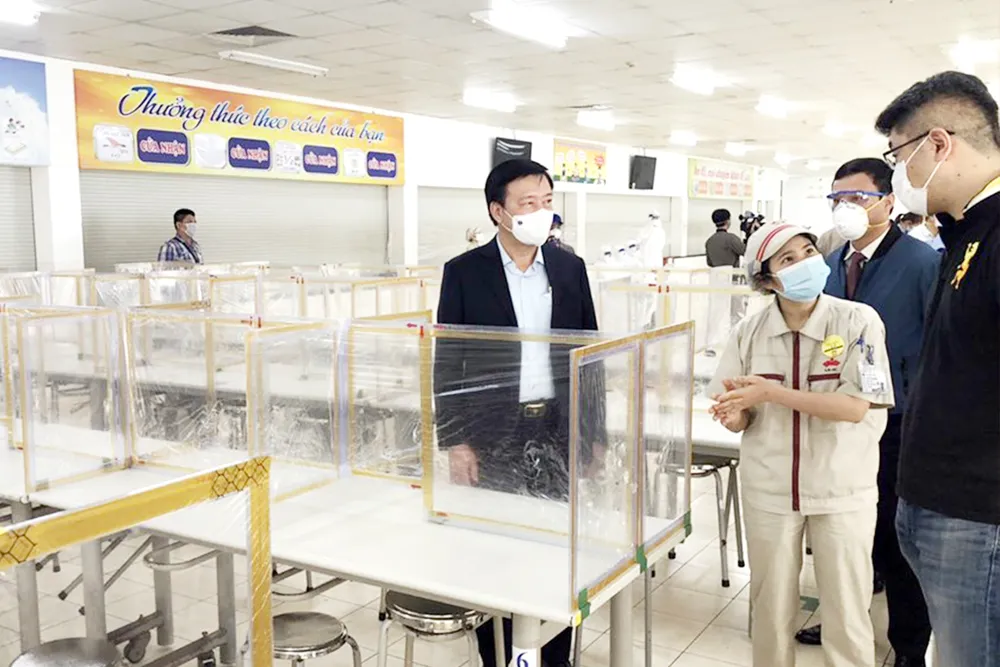 Bí thư Tỉnh ủy Phạm Xuân Thăng kiểm tra công tác xét nghiệm cho công nhân ở Cẩm Giàng. Ảnh: ĐỖ HOÀNG